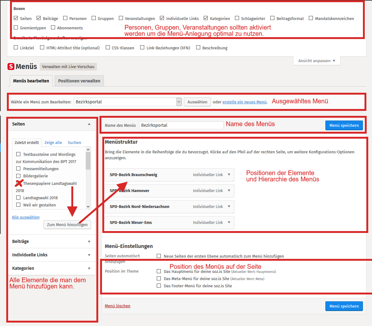 Als nächstes wählt ihr auf der linken Seite dann aus den verschiedenen Feldern die Seiten, Beiträge, Personen, Gruppen oder Kategorien die ihr in der Navigation wollt, aktiviert die Box neben dem Element welches in euer Menü soll und klickt auf den Button „Zum Menü hinzufügen“. Anschließend erscheint das Element bzw. die Elemente auf der rechten Seite. Hier könnt ihr die Position verändern. Zieht ihr ein Element z.B. leicht versetzt unter ein bestehendes so erhaltet ihr einem unterordneten Navigationspunkt.